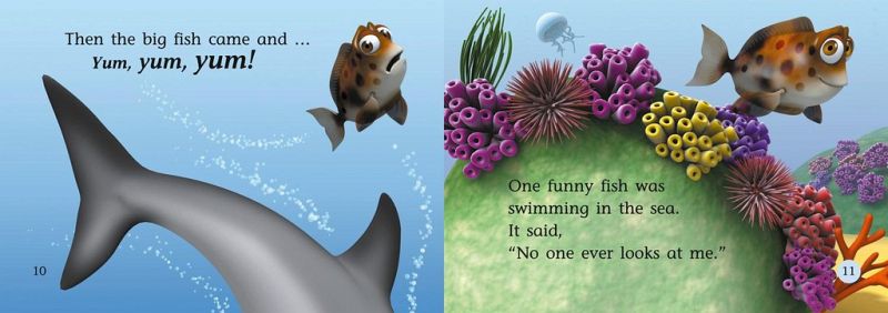A rhyming text about three funny fish and scary-looking big fish with very sharp teeth. Two of the funny fish are brightly coloured but vane, while the third funny fish is brown. The big fish comes along and eats the two brightly coloured fish, but the dull brown one is able to hide safely among the stones on the sea bed!