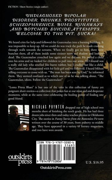 Funny Stories from the Bottomless Pit is a collection of short stories. The heroes of these stories are often homeless and usually mentally ill to one degree or another - bipolar, autistic, schizophrenic, delusional, and so on. We got it all. Oh, and alcoholics. We got alcoholics galore. The young ones are runaways. The older ones are unemployed or in the process of being fired or quitting. Almost all of them are suicidal. They bump into each other over the course of these ten stories, which took thirty years to write, try to cheer each other up. The first story, As Marbles Go, was written in 1986 after I dropped out of high school. It won a junior college prize and was published in their journal even though it was an ugly mess of spelling and grammar mistakes. It has since been revised, cleaned up. Excerpt from As Marble Go: "That realization created a tiny explosion inside his head, unlocking it, and his marbles spilled out onto the floor. Some of them bounced over to where all those cute girls in wool sweaters sat. They had never noticed Humberto as he ogled them from the back row and they still didn't, snobs to the end. Even as his mind machinery lay exposed at their feet, all they could manage was to be disgusted that a boy so inferior to them had had such a horrific accident so near them. What was his problem anyway? A few marbles kept dribbling and spinning and then hopped down the long trail of stairs, for what seemed like forever, and eventually rolled right in between the professor's polished shoes, amid gasps from the class. The professor glared at Humberto above his eye glasses and then aggressively kicked the marble, a small green one, off his stage. The entire class broke into laughter, embarrassing what was left of Humberto as he gathered his books and abruptly headed for the exit, slipping on several marbles along the way out, each fall invoking more laughter."