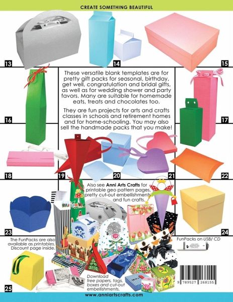 These versatile blank templates are for pretty gift packs for birthday, holiday, get well and congratulation gifts, as well as for favor boxes for weddings, parties and baby showers. Some have additional variations of the same design and many have looped tags or handles. Large boxes have two parts. They are also fun projects for Arts and Crafts classes in schools, retirement homes and for homeschooling. You may also sell the handmade packs that you make.