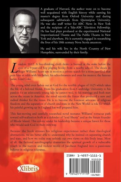 LONDON, 1612. A dealer in cloth is being burned at the stake in a macabre ceremony of theological cleansing. He would be an ordinary man but for his willingness to die in extraordinary pain for his religious convictions. In the festive crowd stands a boy of nine--too young, some would say--to begin to comprehend the meaning of this judicial murder. But the impact of this burning will alter the boy's life and sent him on an unrelenting quest for answers from his society. He is Roger Williams, future founder of Rhode Island, the sanctuary for those who would worship as they please. But it is still thousands of miles and a score of years before his thinking will take flight into the doctrine of "soul liberty." The author evokes the stages of self-awareness as the young Roger gropes with doubts about the validity of a church-state collaboration. His orthodox father threatens to throw him into the street, and neither his parish church nor his schoolmasters are of any help in his search for a just and reassuring God. The random death of a beloved friend from the plague of 1623 so shocks him that he ascends an empty pulpit to admonish the Almighty. This rash confrontation does not go unnoticed by the bishop's spies. From this moment he is a marked man in the eyes of the Anglican Church. But Roger has his friends as well. There is Chief Justice Edward Coke who exposes him to the world of power and who protects him from the fallout of his rashness; his brother Sydrach who introduces him to the strong waters of Dutch liberalism; and young sensible Mary Barnard who helps him back on his path after a disastrous love affair and who accompanies him across the ocean to a rendezvous with destiny. To Roger Williams belongs the honor of being the foremost advocate in the New World of the separation of church and state. For his stance in defense of religious liberty he was reviled and even exiled from his home in Massachusetts Bay colony. But how did the founder of Rhode Island colony as a refuge for non-conformists get to be the sort of person he was? This journey from a childhood at odds with father, schoolteachers and the church to the maturity of a self-possessed champion of religious freedom is carefully chronicled in this fictional autobiography. Because religious experience, more than abstract ideas, permeate the book, it makes no pretense to being a theological tract. It is instead a lucid and compelling account of a young man's climb to greatness in the confines of 17th century Jacobean England. The statue of Roger Williams stands next to Calvin's in Geneva, but the central figure of this fast-paced, almost cinematic, novel, is no creature of stone. His mistakes were all too many, his self-betrayals all too frequent, but he clearly emerges as the complex, courageous apostle of non-conformity whom few of his contemporaries could tolerate, let along understand. History casts Roger Williams' passionate defense of religious freedom in an age of intolerance as a landmark in the evolution of 17th century thought and practice, but this is a posthumous recognition, and the boy attending the fateful burning in 1612 could hardly anticipate where his path would lead. FURNACE takes us through the many intense confrontations that molded his revolutionary stand on the separation of church and state and helps us better to understand the relationship of our own church and state in the light of his spiritual journey