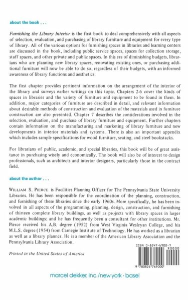 This book discusses the selection, evaluation, and purchase of furniture and equipment for libraries. It examines the arrangement of the interior to update and illuminate earlier writings, and helps those spending even small amounts for library furniture and equipment to do so more wisely.