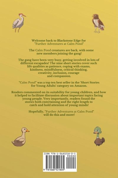 Welcome back to Blackstone Edge for "Further Adventures at Calm Pond" The Calm Pond creatures are back, with some new members joining the gang! The gang have been very busy, getting involved in lots of different escapades! The nine short stories cover such life qualities as patience, coping with exams, kindness, mindfulness, critical thinking, creativity, inclusion, courage and compassion. "Calm Pond" was a top ten best seller in the 'Short Stories for Young Adults' category on Amazon. Readers commented on its suitability for young children, and how it helped to facilitate discussion about important topics facing young people. Very importantly, readers found the stories both entertaining and the right length to catch and hold attention of young minds! Hopefully, "Further Adventures at Calm Pond" will do this and more!