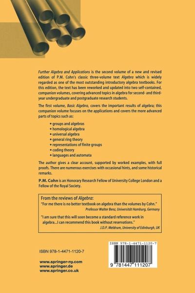 Further Algebra and Applications is the second volume of a new and revised edition of P.M. Cohn's classic three-volume text "Algebra" which is widely regarded as one of the most outstanding introductory algebra textbooks. For this edition, the text has been reworked and updated into two self-contained, companion volumes, covering advanced topics in algebra for second- and third-year undergraduate and postgraduate research students.