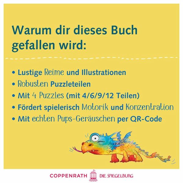 Feinmotorik und Konzentration spielerisch fördernPerfekt für kleine Hände - mit großen, robusten Puzzleteilen4 Puzzle mit 4, 6, 9 und 12 TeilenLustige Reime von Bestsellerautor Kai LüftnerMit echten Knatterdrachen-Pups-Geräuschen per QR-Code