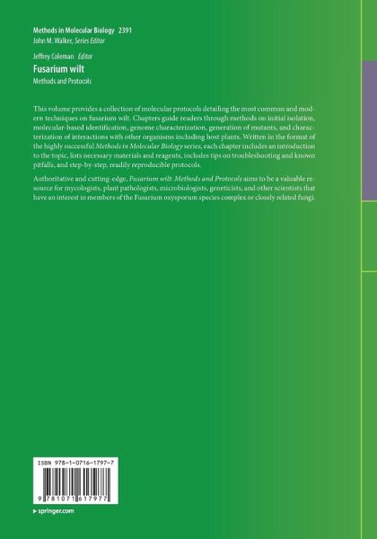 Authoritative and cutting-edge, Fusarium wilt: Methods and Protocols aims to be a valuable resource for mycologists, plant pathologists, microbiologists, geneticists, and other scientists that have an interest in members of the Fusarium oxysporum species complex or closely related fungi.