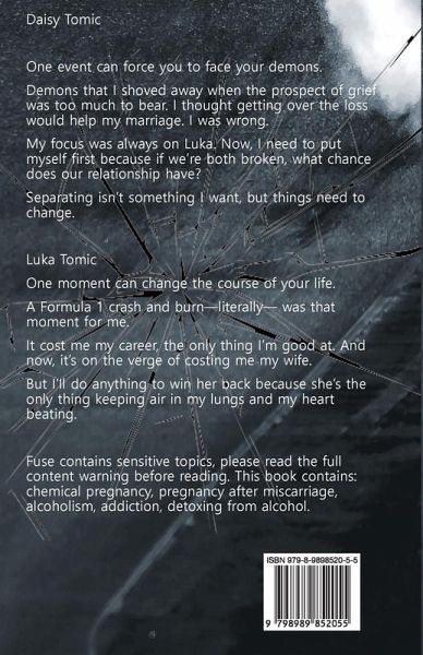 Daisy Tomic One event can force you to face your demons. Demons that I shoved away when the prospect of grief was too much to bear. I thought getting over the loss would help my marriage. I was wrong. My focus was always on Luka. Now, I need to put myself first because if we're both broken, what chance does our relationship have? Separating isn't something I want, but things need to change. Luka Tomic One moment can change the course of your life. A Formula 1 crash and burn-literally- was that moment for me. It cost me my career, the only thing I'm good at. And now, it's on the verge of costing me my wife. But I'll do anything to win her back because she's the only thing keeping air in my lungs and my heart beating. Fuse contains sensitive topics, please read the full content warning before reading. This book contains: chemical pregnancy, pregnancy after miscarriage, alcoholism, addiction, detoxing from alcohol.