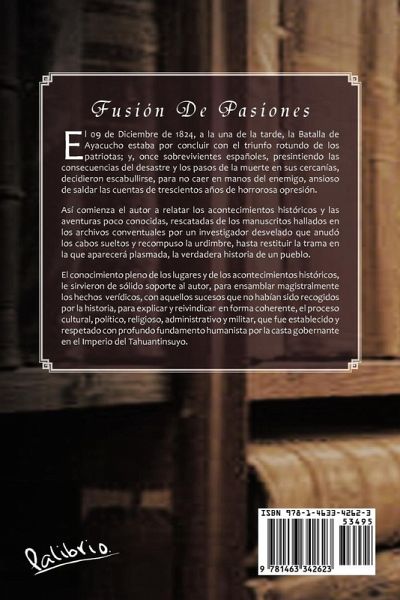 F u s i ó n D e Pa s i o n e s El 09 de Diciembre de 1824, a la una de la tarde, la Batalla de Ayacucho estaba por concluir con el triunfo rotundo de los patriotas; y, once sobrevivientes españoles, presintiendo las consecuencias del desastre y los pasos de la muerte en sus cercanías, decidieron escabullirse, para no caer en manos del enemigo, ansioso de saldar las cuentas de trescientos años de horrorosa opresión. Así comienza el autor a relatar los acontecimientos históricos y las aventuras poco conocidas, rescatadas de los manuscritos hallados en los archivos conventuales por un investigador desvelado que anudó los cabos sueltos y recompuso la urdimbre, hasta restituir la trama en la que aparecerá plasmada, la verdadera historia de un pueblo. El conocimiento pleno de los lugares y de los acontecimientos históricos, le sirvieron de sólido soporte al autor, para ensamblar magistralmente los hechos verídicos, con aquellos sucesos que no habían sido recogidos por la historia, para explicar y reivindicar en forma coherente, el proceso cultural, político, religioso, administrativo y militar, que fue establecido y respetado con profundo fundamento humanista por la casta gobernante en el Imperio del Tahuantinsuyo.