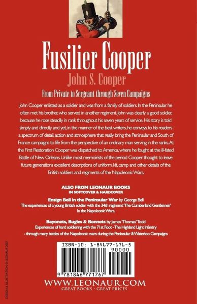 FUSILIER COOPER. Private to Sergeant through seven campaigns. John Cooper enlisted as a soldier and was from a family of soldiers. In the Peninsular he often met his brother, who served in another regiment. John was clearly a good soldier, because he rose steadily in rank throughout his seven years of service. His story is told simply and directly and yet, in the manner of the best writers, he conveys to his readers a spectrum of detail, action and atmosphere that really bring the Peninsular and South of France campaigns to life from the perspective of an ordinary man serving in the ranks. At the First Restoration Cooper was dispatched to America, where he fought at the ill-fated Battle of New Orleans. Unlike most memoirists of the period Cooper thought to leave future generations excellent descriptions of uniform, kit, camp and other details of the British soldiers and regiments of the Napoleonic Wars.