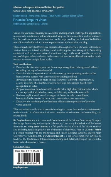 This book presents a thorough overview of fusion in computer vision, from an interdisciplinary and multi-application viewpoint, describing successful approaches, evaluated in the context of international benchmarks that model realistic use cases. Features: examines late fusion approaches for concept recognition in images and videos; describes the interpretation of visual content by incorporating models of the human visual system with content understanding methods; investigates the fusion of multi-modal features of different semantic levels, as well as results of semantic concept detections, for example-based event recognition in video; proposes rotation-based ensemble classifiers for high-dimensional data, which encourage both individual accuracy and diversity within the ensemble; reviews application-focused strategies of fusion in video surveillance, biomedical information retrieval, and content detection in movies; discusses the modeling of mechanisms of human interpretation ofcomplex visual content.