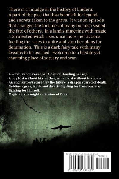 There is a smudge in the history of Lindera. A part of the past that has been left for legend and secrets taken to the grave. It was an episode that changed the fortunes of many but also sealed the fate of others. In a land simmering with magic, a tormented witch rises once more, her actions fuelling the races to unite and stop her plans for domination. This is a dark fairy tale with many lessons to be learned - welcome to a hostile yet charming place of sorcery and war. A witch, set on revenge. A demon, feeding her ego. A boy lost without his mother, a man lost without his home. An enchantress scared by the future, a dragon scared of death. Goblins, ogres, trolls and dwarfs fighting for freedom, man fighting for himself. Magic versus might - a Fusion of Evils.