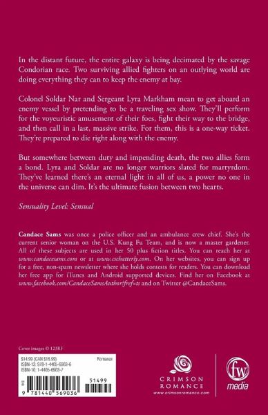 In the distant future, the entire galaxy is being decimated by the savage Condorian race. Two surviving allied fighters on an outlying world are doing everything they can to keep the enemy at bay. Colonel Soldar Nar and Sergeant Lyra Markham mean to get aboard an enemy vessel by pretending to be a travelling sex show. They'll perform for the voyeuristic amusement of their foes, fight their way to the bridge, and then call in a last massive strike. For them this is a one-way ticket. They're prepared to die right along with the enemy. But somewhere between duty and impending death the two allies form a bond. Lyra and Soldar are no longer warriors slated for martyrdom. They've learned there's an eternal light in all of us, a power no one in the universe can dim. It's the ultimate fusion between two hearts. Sensuality Level: Sensual