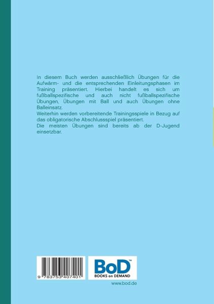 In diesem Buch werden ausschließlich Übungen für die Aufwärm- und die entsprechenden Einleitungsphasen im Training präsentiert. Hierbei handelt es sich um fußballspezifische und auch nicht fußballspezifische Übungen, Übungen mit Ball und auch Übungen ohne Balleinsatz.Weiterhin werden vorbereitende Trainingsspiele in Bezug auf das obligatorische Abschlussspiel präsentiert. Die meisten Übungen sind bereits ab der D-Jugend einsetzbar.