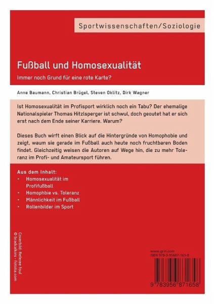 Fachbuch aus dem Jahr 2015 im Fachbereich Sport - Sportsoziologie, , Sprache: Deutsch, Abstract: Ist Homosexualität im Profisport wirklich noch ein Tabu? Der ehemalige Nationalspieler Thomas Hitzlsperger ist schwul, doch geoutet hat er sich erst nach dem Ende seiner Karriere. Warum?Dieses Buch wirft einen Blick auf die Hintergründe von Homophobie und zeigt, waum sie gerade im Fußball auch heute noch fruchtbaren Boden findet. Gleichzeitig weisen die Autoren auf Wege hin, die zu mehr Toleranz im Profi- und Amateursport führen.Aus dem Inhalt:- Homosexualität im Profifußball- Homophbie vs. Toleranz- Männlichkeit im Fußball- Rollenbilder im Sport