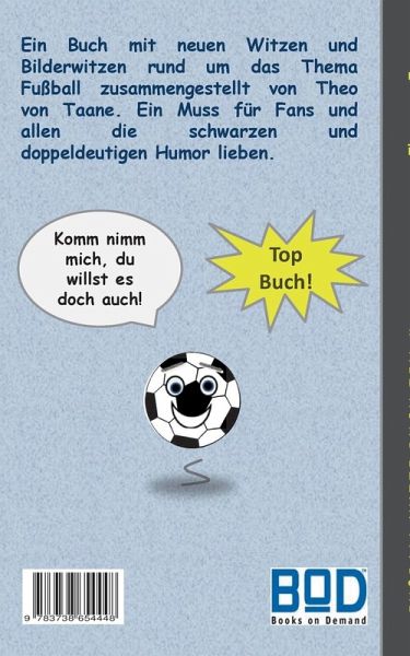Aus der Humor Reihe: "Heute schon gelacht?" Ein Buch mit neuen Witzen und Bilderwitzen rund um das Thema Fußball zusammengestellt von Theo von Taane. Ein Muss für Fans und allen die schwarzen und doppeldeutigen Humor lieben. Lustige Witze mit Freistoß Effekt!
