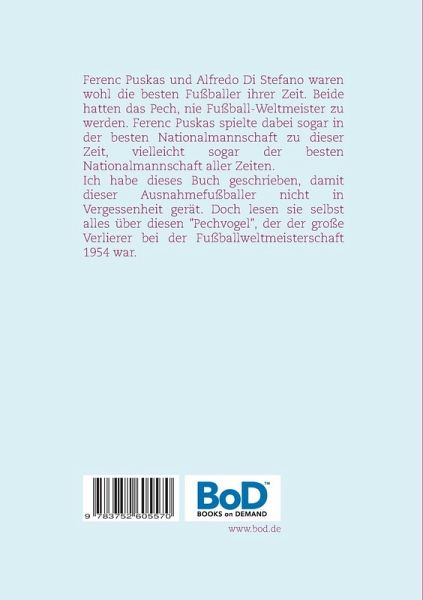Ferenc Puskas und Alfredo Di Stefano waren wohl die besten Fußballer ihrer Zeit. Beide hatten das Pech, nie Fußball-Weltmeister zu werden. Ferenc Puskas spielte dabei sogar in der besten Nationalmannschaft zu dieser Zeit, vielleicht sogar der besten Nationalmannschaft aller Zeiten.Ich habe dieses Buch geschrieben, damit dieser Ausnahmefußballer nicht in Vergessenheit gerät. Doch lesen sie selbst alles über diesen "Pechvogel", der der große Verlierer bei der Fußballweltmeisterschaft 1954 war.