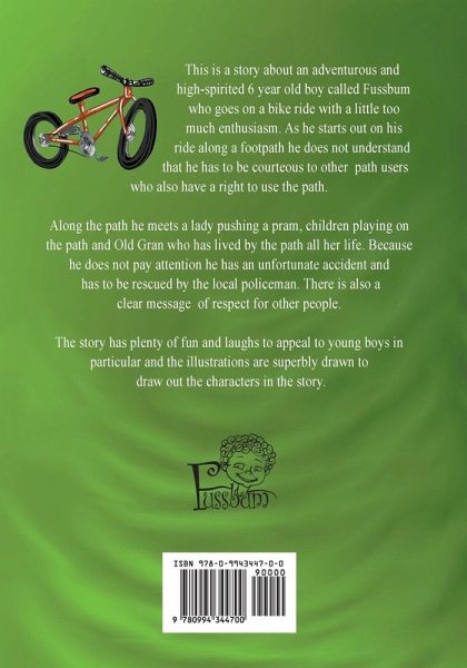 This is a story about an adventurous and high-spirited 6 year old boy called Fussbum who goes on a bike ride with a little too much enthusiasm. As he starts out on his ride along a footpath he does not understand that he has to be courteous to other path users who also have a right to use the path. Along the path he meets a lady pushing a pram, children playing on the path and Old Gran who has lived by the path all her life. Because does not pay attention he has an unfortunate accident and has to be rescued by the local policeman. There is also a clear message of respect for other people. The story has plenty of fun and laughs to appeal to young boys in particular and the illustrations are superbly drawn to draw out the characters in the story.