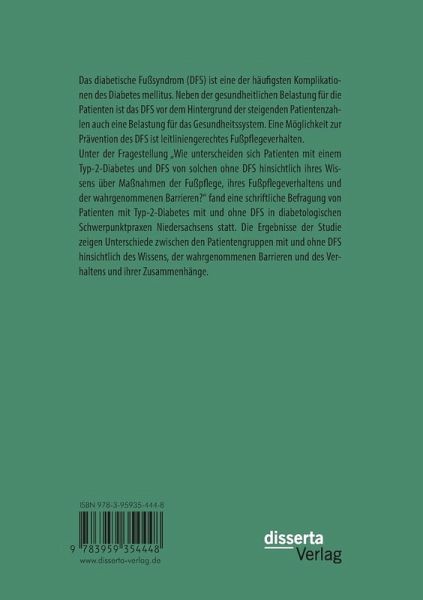 Die Patienten mit DFS weisen ein besseres Fußpflegewissen und günstigeres Fußpflegeverhalten auf, nehmen aber mehr Barrieren in der Gesunderhaltung ihrer Füße wahr. Es ergibt sich kein Zusammenhang zwischen Barrieren und Verhalten sowie den Barrieren und dem Wissen. Das Wissen ist hingegen in beiden Gruppen mit dem Verhalten assoziiert.