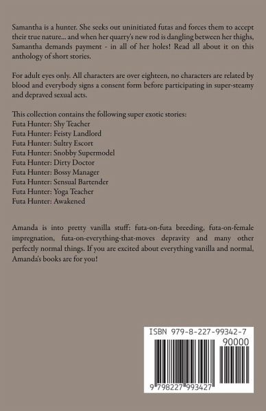 Samantha is a hunter. She seeks out uninitiated futas and forces them to accept their true nature... and when her quarry's new rod is dangling between her thighs, Samantha demands payment - in all of her holes! Read all about it on this anthology of short stories. For adult eyes only. All characters are over eighteen, no characters are related by blood and everybody signs a consent form before participating in super-steamy and depraved sexual acts. This collection contains the following super exotic stories: Futa Hunter: Shy Teacher Futa Hunter: Feisty Landlord Futa Hunter: Sultry Escort Futa Hunter: Snobby Supermodel Futa Hunter: Dirty Doctor Futa Hunter: Bossy Manager Futa Hunter: Sensual Bartender Futa Hunter: Yoga Teacher Futa Hunter: Awakened
