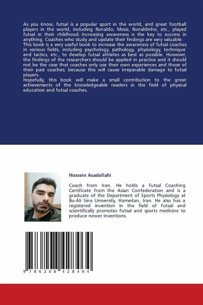 As you know, futsal is a popular sport in the world, and great football players in the world, including Ronaldo, Messi, Ronaldinho, etc., played futsal in their childhood. Increasing awareness is the key to success in anything. Coaches who study and update their findings are very valuable.This book is a very useful book to increase the awareness of futsal coaches in various fields, including psychology, pathology, physiology, technique and tactics, etc., to develop futsal athletes as best as possible. However, the findings of the researchers should be applied in practice and it should not be the case that coaches only use their own experiences and those of their past coaches; because this will cause irreparable damage to futsal players.Hopefully, this book will make a small contribution to the great achievements of the knowledgeable readers in the field of physical education and futsal coaches.