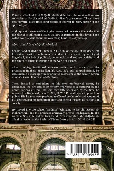 Futuh al-Ghaib of Abd Al Qadir al-Jilani Perhaps the most well known collection of Shaykh Abd Al Qadir Al-Jilani's ,discourses. These short and powerful discourses cover topics of interest to every seeker of the spiritual path. A glimpse at the some of the topics covered will reassure the reader that the Shaykh is addressing issues that are as pertinent in this day and age as the day he spoke about them so many hundreds of years ago About Shaikh 'Abd al-Qadir al-Jilani Shaikh 'Abd al-Qadir al-Jilani In A.H. 488, at the age of eighteen, left his native province to become a student in the great capital city of Baghdaad, the hub of political, commercial and cultural activity, and the center of religious learning in the world of Islaam. After studying traditional sciences under such teachers as the prominent Hanbalii jurist [faqiih], Abuu Sa'd 'Alii al-Mukharrimii, he encountered a more spiritually oriented instructor in the saintly person of Abu'l-Khair Hammaad ad-Dabbaas. Then, instead of embarking on his own professorial career, he abandoned the city and spent twenty-five years as a wanderer in the desert regions of 'Iraq. He was over fifty years old by the time he returned to Baghdaad, in A.H. 521/1127 C.E., and began to preach in public. His hearers were profoundly affected by the style and content of his lectures, and his reputation grew and spread through all sections of society. He moved into the school [madrasa] belonging to his old teacher al-Mukharrimii, but the premises eventually proved inadequate. In the words of Shaikh Muzaffer Ozak Efendi: 'The venerable 'Abd al-Qadir al-Jilani passed on to the Realm of Divine Beauty in A.H. 561/1166 C.E.,