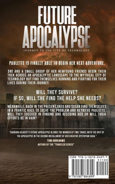 Paulette is finally able to begin her next adventure. She and a small group of her newfound friends begin their trek across an apocalyptic landscape to the mythical City of Technology but find themselves running and fighting for their lives during their journey.Will they survive?If so, will she find the help she needs? Meanwhile, back in the present, Greg and Susan find themselves in a frantic race to solve the problem and retrieve Paulette. Will they succeed in finding and rescuing her or will their efforts be in vain? "Barbara Gilbert's Future Apocalypse blends the wonder of time travel with the grit of the apocalypse in the second installment of her creative dystopian saga." by: Tom Abrahams, Author of the "Traveler Series"