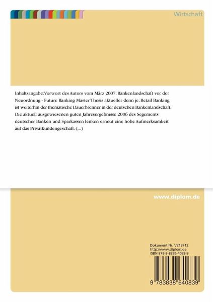 Die vorliegende Master Thesis beschreibt die wesentlichen Entwicklungen im deutschen Retail-Bankenmarkt en detail - und mit besonderen Hinblick auf die drei Säulen des deutschen Kreditgewerbes, den öffentlich-rechtlichen Sektor, den genossenschaftlichen Bereich und das private Bankgewerbe. Hilfreich für das Verständnis ist auch die strukturierte Einordnung des deutschen Bankenmarktes in den europäischen Kontext sowie das verständliche Erklären unterschiedlicher Marktbearbeitungsstrategien, die von der bloßen Preisführerschaft zum exquisiten Nischenanbieter reichen. Die vorliegende Master Thesis wurde mit der Gesamtnote 1,3 ausgezeichnete und ist eine umfangreiche Wissensquelle und immer noch hochaktuelle Fundgrube für alle, die sich ernsthaft mit Retail Banking in Deutschland beschäftigen.