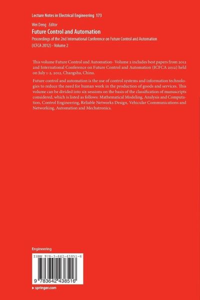 This volume Future Control and Automation- Volume 2 includes best papers from 2012 2nd International Conference on Future Control and Automation (ICFCA 2012) held on July 1-2, 2012, Changsha, China.