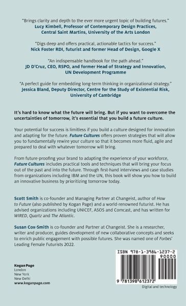 It's hard to know what specific opportunities, technologies or challenges the future will bring. If you want to overcome the uncertainties of tomorrow, it's essential that you build a future culture. The potential for success is limitless for businesses which develop a culture designed for innovating and adapting to the future. Drawing upon decades of experience as futurists and consultants, Scott Smith and Susan Cox-Smith offer proven strategies that will allow you to fundamentally rewire your culture so that it becomes more fluent, agile and prepared to deal with whatever tomorrow will bring. From futureproofing your brand and manifesto to adapting the experience of your workforce, Future Cultures offers practical tools and techniques that will bring your focus out of the past and into the future. Through first-hand interviews and case studies from multinational companies such as IBM and the UN, this book will show how you can join the world's most innovative businesses by prioritizing tomorrow today.