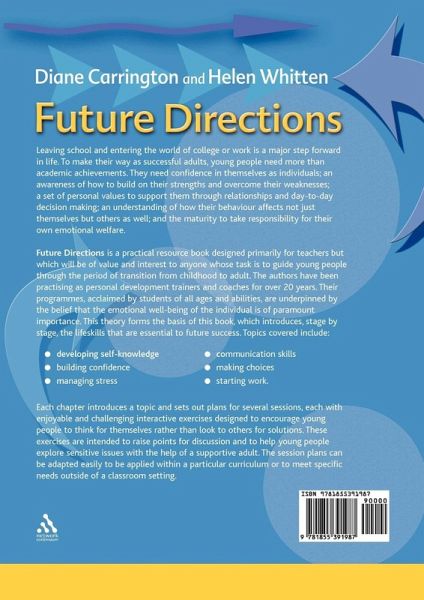 Future Directions is specially created to support teachers as they guide their pupils through the exciting and often perplexing period of transition from school to adult life. It provides a series of lesson plans designed to help pupils explore sensitive issues within the security of the classroom. Each lesson includes interactive exercises which will encourage pupils to: - think for themselves - recognize their own strengths - build confidence - learn how to manage stress - set realistic goals - develop communication skills - make choices - prepare for starting work. All the exercises are on photocopiable sheets and the lesson plans can be adapted easily to meet specific needs.