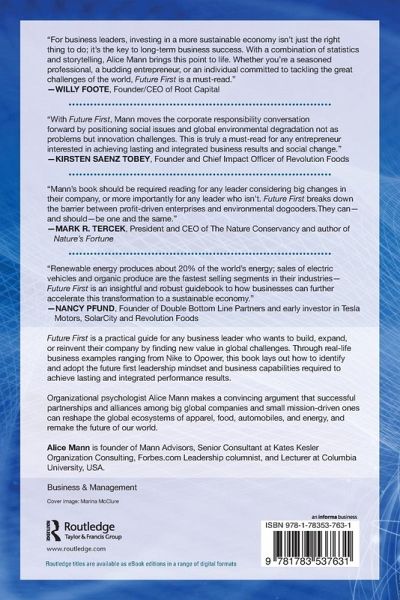 Future First is a practical guide for any business leader who wants to build, expand, or reinvent their company by finding new value in global challenges. Traditional companies often view issues like income equality, global warming, and resource scarcity as "problems." By contrast, future first leaders understand them as opportunities, as innovation challenges. Through real-life business examples ranging from Nike to Opower, this book lays out how to identify and adopt the future first leadership mindset and business capabilities required to achieve lasting and integrated performance results. Future First examines how leaders from companies including Unilever, Etsy, Revolution Foods, Method Products, and others have adopted this mindset toward innovation and people practices, accelerating business ecosystem transformation. Alice Mann, an organizational psychologist with twenty years of experience consulting and coaching on executive leadership, organization design, and business transformation, interviewed scores of business leaders to understand how their companies are expanding into new value frontiers. Future First makes a convincing argument that successful partnerships and alliances among big global companies and small mission-driven ones can reshape the global ecosystems of apparel, food, automobiles, and energy, and remake the future of our world.