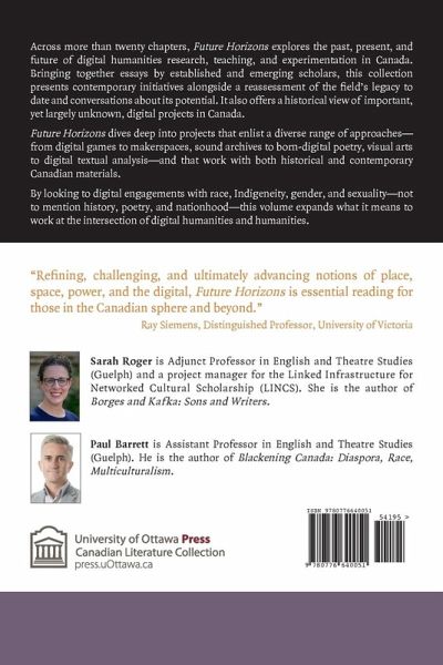 Across more than twenty chapters, Future Horizons explores the past, present, and future of digital humanities research, teaching, and experimentation in Canada. Bringing together work by established and emerging scholars, this collection presents contemporary initiatives in digital humanities alongside a reassessment of the field's legacy to date and conversations about its future potential. It also offers a historical view of the important, yet largely unknown, digital projects in Canada. Future Horizons offers deep dives into projects that enlist a diverse range of approaches--from digital games to makerspaces, sound archives to born-digital poetry, visual arts to digital textual analysis--and that work with both historical and contemporary Canadian materials. The essays demonstrate how these diverse approaches challenge disciplinary knowledge by enabling humanities researchers to ask new questions. The collection challenges the idea that there is either a single definition of digital humanities or a collective national identity. By looking to digital engagements with race, Indigeneity, gender, and sexuality--not to mention history, poetry, and nationhood--this volume expands what it means to work at the intersection of digital humanities and humanities in Canada today. Available formats: trade paperback, accessible PDF, and accessible ePub