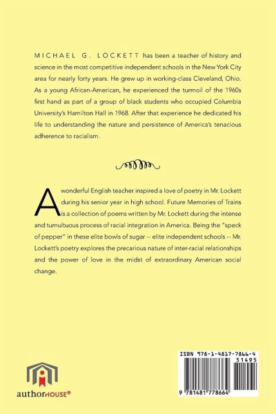 A wonderful English teacher inspired a love of poetry in Mr. Lockett during his senior year in high school. Future Memories of Trains is a collection of poems written by Mr. Lockett during the intense and tumultuous process of racial integration in America. Being the "speck of pepper" in these elite bowls of sugar -- elite independent schools -- Mr. Lockett's poetry explores the precarious nature of inter-racial relationships and the power of love in the midst of extraordinary American social change.