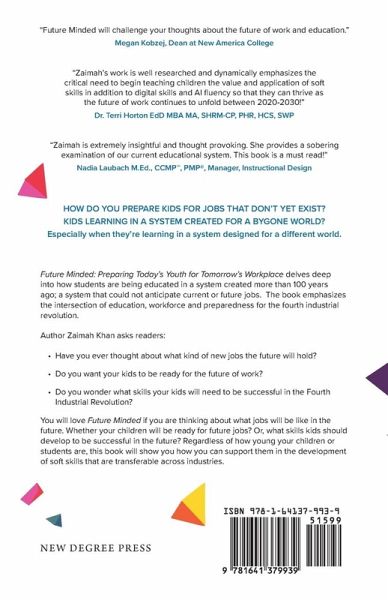 How do you prepare kids for jobs that don't yet exist? Kids learning in a system created for a bygone world? Especially when they're learning in a system designed for a different world. Future Minded: Preparing Today's Youth for Tomorrow's Workplace delves deep into how students are being educated in a system created more than 100 years ago; a system that could not anticipate current or future jobs. The book emphasizes the intersection of education, workforce and preparedness for the fourth industrial revolution. Author Zaimah Khan asks readers: Have you ever thought about what kind of new jobs the future will hold? Do you want your kids to be ready for the future of work? Do you wonder what skills your kids will need to be successful in the Fourth Industrial Revolution? You will love Future Minded if you are thinking about what jobs will be like in the future. Whether your children will be ready for future jobs? Or, what skills kids should develop to be successful in the future? Regardless of how young your children or students are, this book will show you how you can support them in the development of soft skills that are transferable across industries.