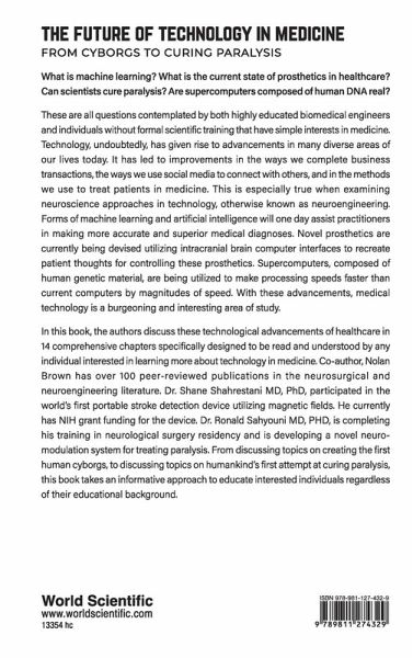 What is machine learning? What is the current state of prosthetics in healthcare? Can scientists cure paralysis? Are supercomputers composed of human DNA real? These are all questions contemplated by both highly educated biomedical engineers and individuals without formal scientific training that have simple interests in medicine. Technology, undoubtedly, has given rise to advancements in many diverse areas of our lives today. It has led to improvements in the ways we complete business transactions, the ways we use social media to connect with others, and in the methods we use to treat patients in medicine. This is especially true, when examining neuroscience approaches in technology, otherwise known as neuroengineering. Concepts such as machine learning and artificial intelligence will one day assist practitioners in making more accurate and superior medical diagnoses. Novel prosthetics are currently being devised utilizing intracranial brain computer interfaces to recreate patient thoughts for controlling these prosthetics. Supercomputers, composed of human genetic material, are being utilized to make processing speeds faster than current computers by magnitudes of speed. With all of these advancements, medical technology is a burgeoning and interesting area of study. In this book, the authors discuss these technological advancements of healthcare in 14 comprehensive chapters specifically designed to be read and understood by any individual interested in learning more about technology in medicine. Co-author, Nolan Brown has over 100 peer-reviewed publications in the neurosurgical and neuroengineering literature. Dr Shane Shahrestani MD, PhD, participated in the world's first portable stroke detection device utilizing magnetic fields. He currently has NIH grant funding for the device. Dr Ronald Sahyouni MD, PhD, has novel work in myoelectric prosthetic devices. From discussing topics such as creating the first human cyborgs, to discussing topics on humankind's first attempt at curing paralysis, this book takes an informative approach to educate interested individuals regardless of their educational background.
