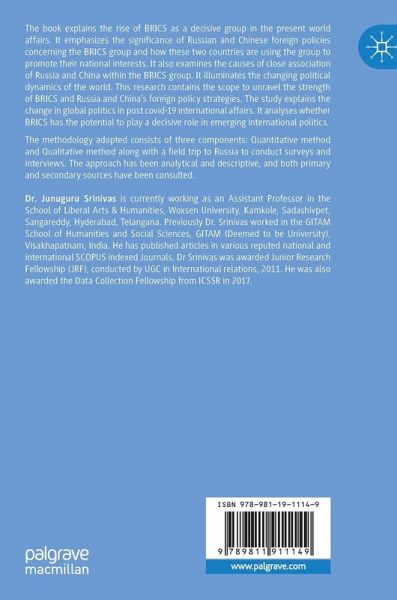 The book explains the rise of BRICS as a decisive group in the present world affairs. It emphasizes the significance of Russian and Chinese foreign policies concerning the BRICS group and how these two countries are using the group to promote their national interests. It also examines the causes of close association of Russia and China within the BRICS group. It illuminates the changing political dynamics of the world. This research contains the scope to unravel the strength of BRICS and Russia and China's foreign policy strategies. The study explains the change in global politics in post covid-19 international affairs. It analyses whether BRICS has the potential to play a decisive role in emerging international politics.