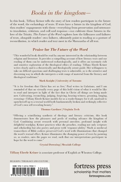 In scripture, Jesus promises a future that potentially infuses all texts: "my words will not pass away"(Matt 24:28). This book argues that texts--even literary texts--, have an eschatology, too, a part in God's purpose for the cosmos. They, with all creation, move toward participation in the new creation, in the Trinity's expanding, creative love. This eschatological future for texts impacts how we understand meaning making, from the level of semiology to that of hermeneutics. This book tells the story of how readers participate in the future of the word, the eschatology of texts. If texts have a future in the kingdom of God, then readers' engagements with them--everything from preservation and utterance to translation, criticism, and call and response--can cultivate those futures in the love of the Trinity. Kriner explores how the fallenness and failures of texts, alongside readers' own failures, while seeming to challenge the future of the word, ultimately point to reading as a posture of reconciliation, in which reader and text meet in the Maranatha of all text.