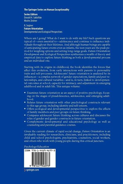 From the reviews: "Future orientation, its antecedents, and its outcomes are the focus of Rachel Seginer's book Future Orientation: Developmental and Ecological Perspectives. The book provides a comprehensive review of the theoretical approaches to future orientation, focusing primarily on adolescent development. ... Readers ... will find the book a useful reference on the topic of future orientation." (Shelia M. Kennison, PsycCRITIQUES, Vol. 54 (45), November, 2009)