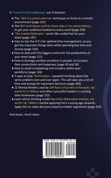 Do you want to discover how to be a stable and strong leader in unpredictable times? Do you wonder how to guide people in the right direction by recognizing their emotions? Or do you want to learn how to manage people more effectively and how to make better decisions, so you can cut your workweek from 60 to 40 hours? Then keep reading... A recent study in Career Builder shows that 71% of the hiring managers said: ¿An employee¿s Emotional Intelligence (or EQ), is more important than their IQ¿. 75% of them even said they were more likely to promote a high-EQ employee than a high IQ employee. Furthermore, successful people like Tony Robbins (net worth: $500 million), Oprah Winfrey (net worth: 2,7 million) have admitted applying NLP (Neuro-Linguistic Programming) and Systemized Thought Models to reach their success. In ¿Future Proof Leadership¿ yoüll discover:This ¿NLP-in-control-exercise¿ technique to thrive in a chaotic environment (page 191) The NLP techniques used by Steve Jobs in his presentations, to get your audience hooked on every word (page 239) ¿The-Instant-Motivator¿, works like rocket-fuel for your team (page 187) How to Use the 4 D¿s for optimal time management, so you get the important things done while spending less time and money (page 220) How to deal with the biggest enemy for the productivity of your team (page 121) How to leverage positive emotions in people, to increase their productivity and happiness (page 43 and 58) How to avoid complaining and mockery within your workforce (page 126) 7 ways to stop ¿Rumination¿, repeated thinking about the same problem over and over again. This will save you a lot of time and energy for important decisions (page 340) 12 Mental Models used by Jeff Bezos (Founder of Amazon, net worth $111 Billion) and other successful leaders in running their businesses (page 252) Learn which thinking model Ray Dalio (Billionaire investor, net worth 18,7 Billion) started applying from a young age onwards. Apply this to make decisions based on better arguments (page 326) Maybe yoüre doubting if reading a book can help in your busy life as a modern-day leader. That¿s why the unique 30-day Emotional Intelligence Booster Program is included. It¿s specially developed to raise your EQ as a leader. Even if yoüre a high-school drop-out, the good news about this program and the thinking models is that they work so well, because of the simplicity and ease of use. So, you don¿t need the IQ of Einstein to practically use them. Don¿t wait until the recession hits, scroll up and click ¿Add to cart¿ to become the well-respected and future proof leader you deserve to be.