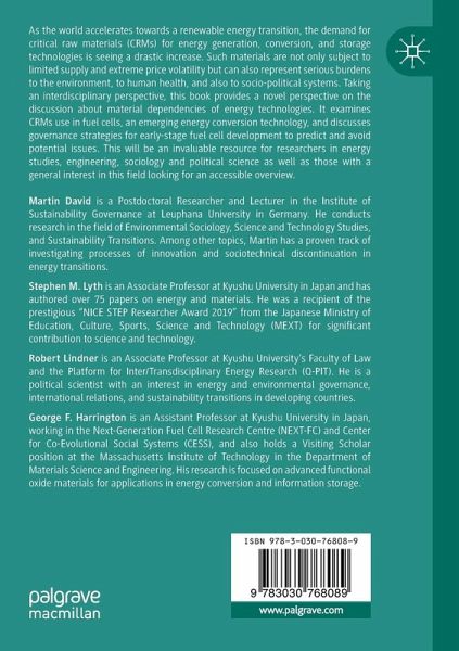 As the world accelerates towards a renewable energy transition, the demand for critical raw materials (CRMs) for energy generation, conversion, and storage technologies is seeing a drastic increase. Such materials are not only subject to limited supply and extreme price volatility but can also represent serious burdens to the environment, to human health, and also to socio-political systems. Taking an interdisciplinary perspective, this book provides a novel perspective on the discussion about material dependencies of energy technologies. It examines CRMs use in fuel cells, an emerging energy conversion technology, and discusses governance strategies for early-stage fuel cell development to predict and avoid potential issues. This will be an invaluable resource for researchers in energy studies, engineering, sociology and political science as well as those with a general interest in this field looking for an accessible overview.