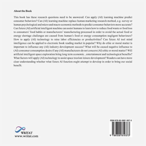 This book has these research questions need to be answered: Can apply (AI) learning machine predict consumer behaviors? Can (AI) learning machine replace human marketing research method, e.g. survey or human psychological and micro and macro economic methods to predict consumer behaviors more accurate? Can future (AI) artificial intelligent machine can assist humans to learn how to reduce food waste or food loss to consumers' food habits or manufacturers' manufacturing processed in order to avoid the actual food or energy shortage challenges are caused from human's food or energy consumption negligent behaviours? How to apply (AI) technology to raise labor efficiencies or productivities? Can future AI tool mind intelligence can be applied to electronic book reading market in popular? Why do ethic or moral matter is important to influence any (AI) industry development success? What will be caused negative influence to (AI) consumer consumption desire if any (AI) manufacturers do not concern (AI) ethic or moral matter? Will artificial intelligent space exploration bring long term economic , entertainment and technological benefits? What factors will apply (AI) technology to assist space tourism leisure development? Readers can have more clear understanding whether what future AI function ought attempt to develop in order to bring our social benefit.