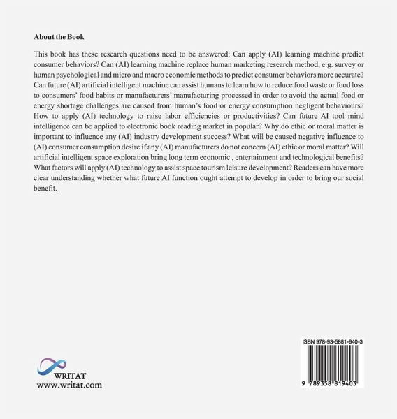 This book has these research questions need to be answered: Can apply (AI) learning machine predict consumer behaviors? Can (AI) learning machine replace human marketing research method, e.g. survey or human psychological and micro and macro economic methods to predict consumer behaviors more accurate? Can future (AI) artificial intelligent machine can assist humans to learn how to reduce food waste or food loss to consumers' food habits or manufacturers' manufacturing processed in order to avoid the actual food or energy shortage challenges are caused from human's food or energy consumption negligent behaviours? How to apply (AI) technology to raise labor efficiencies or productivities? Can future AI tool mind intelligence can be applied to electronic book reading market in popular? Why do ethic or moral matter is important to influence any (AI) industry development success? What will be caused negative influence to (AI) consumer consumption desire if any (AI) manufacturers do not concern (AI) ethic or moral matter? Will artificial intelligent space exploration bring long term economic , entertainment and technological benefits? What factors will apply (AI) technology to assist space tourism leisure development? Readers can have more clear understanding whether what future AI function ought attempt to develop in order to bring our social benefit.