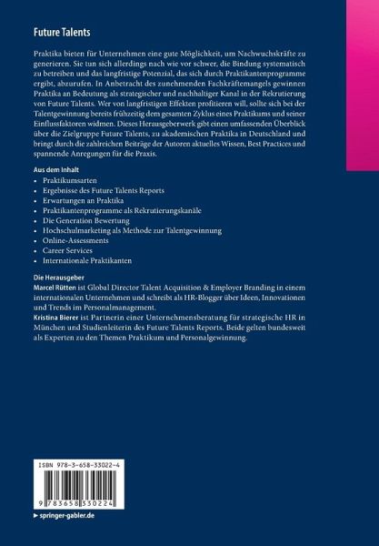 Praktikumsarten.- Ergebnisse der Studie "Future Talents Report".- Was erwarten die Studierenden von ihrem Praktikum?- Praktikantenprogramme als Rekrutierungskanäle.- Die Generation Bewertung.- Hochschulmarketing als Methode zur Talentgewinnung.- Online-Assessment.- Career Services.- Herausforderungen bei der Vermittlung internationaler Praktikanten.