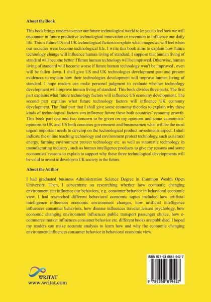 This book brings readers to enter our future technological world to let you to feel how we will encounter in future predictive technological innovation or invention to influence our daily life. This is future US and UK technological fiction to explain what images we will feel when our societies were become technological life. I write this book aims to explain how future technology change will influence human living of standard. I suppose that human living of standard will become better if future human technology will be improved. Otherwise, human living of standard will become worse if future human technology won't be improved , even will be fallen down. I shall give US and UK technologies development past and present evidences to explain how their technologies development will improve human living of standard. I hope readers can make personal judgment to evaluate whether technology development will improve human living of standard. This book divides three parts. The first part explains what future technology factors will influence US economy development. The second part explains what future technology factors will influence UK economy development. The final part that I shall give some economy theories to explain why these kinds of technological factors can influence future these both countries' economy growth. This book part one and two concern to be given on my opinions and some economists' opinions to UK and US both countries government and businessmen what will be the most urgent important needs to develop on the technological product investments aspect. I shall indicate the online teaching technology and environment protect technology, such as natural energy, farming environment protect technology etc. as well as automatic technology in manufacturing industry , such as human intelligence products to give my reasons and some economists' reasons to explain to support why these three technological developments will be valid to invest to develop to UK society in the future.