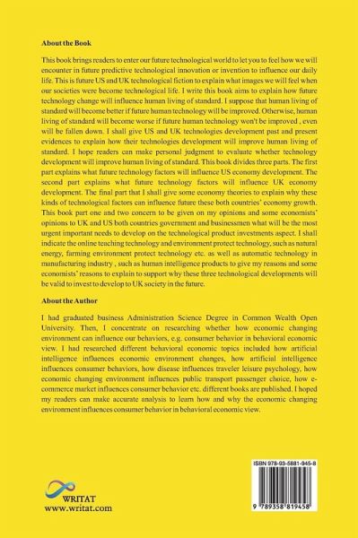 This book brings readers to enter our future technological world to let you to feel how we will encounter in future predictive technological innovation or invention to influence our daily life. This is future US and UK technological fiction to explain what images we will feel when our societies were become technological life. I write this book aims to explain how future technology change will influence human living of standard. I suppose that human living of standard will become better if future human technology will be improved. Otherwise, human living of standard will become worse if future human technology won't be improved , even will be fallen down. I shall give US and UK technologies development past and present evidences to explain how their technologies development will improve human living of standard. I hope readers can make personal judgment to evaluate whether technology development will improve human living of standard. This book divides three parts. The first part explains what future technology factors will influence US economy development. The second part explains what future technology factors will influence UK economy development. The final part that I shall give some economy theories to explain why these kinds of technological factors can influence future these both countries' economy growth. This book part one and two concern to be given on my opinions and some economists' opinions to UK and US both countries government and businessmen what will be the most urgent important needs to develop on the technological product investments aspect. I shall indicate the online teaching technology and environment protect technology, such as natural energy, farming environment protect technology etc. as well as automatic technology in manufacturing industry , such as human intelligence products to give my reasons and some economists' reasons to explain to support why these three technological developments will be valid to invest to develop to UK society in the future.