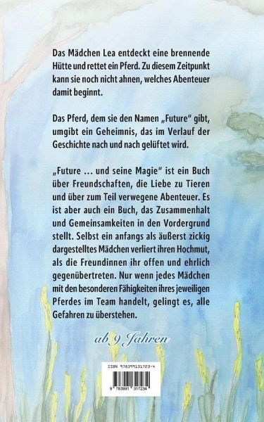 Das Mädchen Lea entdeckt eine brennende Hütte und rettet ein Pferd. Zu diesem Zeitpunkt kann sie noch nicht ahnen, welches Abenteuer damit beginnt.Das Pferd, dem sie den Namen "Future" gibt, umgibt ein Geheimnis, das im Verlauf der Geschichte nach und nach gelüftet wird."Future ... und seine Magie" ist ein Buch über Freundschaften, die Liebe zu Tieren und über zum Teil verwegene Abenteuer. Es ist aber auch ein Buch, das Zusammenhalt und Gemeinsamkeiten in den Vordergrund stellt. Selbst ein anfangs als äußerst zickig dargestelltes Mädchen verliert ihren Hochmut, als die Freundinnen ihr offen und ehrlich gegenübertreten. Nur wenn jedes Mädchen mit den besonderen Fähigkeiten ihres jeweiligen Pferdes im Team handelt, gelingt es, alle Gefahren zu überstehen.