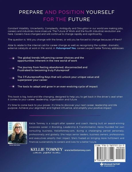 PREPARE AND POSITION YOURSELF FOR THE FUTURE Constant Volatility, Uncertainty, Complexity, Ambiguity and Disruption in our world are making jobs, careers and industries more insecure. The Future of Work and the fourth industrial revolution are here. Careers have changed and will continue to change rapidly and significantly. The question is: Will you change with the times, or will you be forced to change because of them? Able to relate to the internal call for career change as well as recognising the sudden, dramatic, external catalysts at work in the world, in Futureproof You, careers expert Kellie Tomney addresses:The global trends influencing career choices and the opportunities inherent in the new world of work The journey from feeling abandoned, disconnected and Frustrated to becoming truly Futureproof The 3 Futureproofing Keys that will unlock your unique value and superpower your career The tools to adapt and grow in an ever-evolving cycle of impact This book is big, bold and life-changing, designed to help you to get back in the driver's seat when it comes to your career, leadership, organisation and future. It's time to come back to your power. It's time to discover your next career, leadership and life purpose. Achieve your alignment and highest influence, and amplify your positive impact.