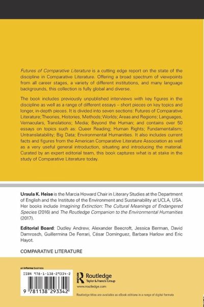 Futures of Comparative Literature is a cutting edge report on the state of the discipline in Comparative Literature. Offering a broad spectrum of viewpoints from all career stages, a variety of different institutions, and many language backgrounds, this collection is fully global and diverse. The book includes previously unpublished interviews with key figures in the discipline as well as a range of different essays - short pieces on key topics and longer, in-depth pieces. It is divided into seven sections: Futures of Comparative Literature; Theories, Histories, Methods; Worlds; Areas and Regions; Languages, Vernaculars, Translations; Media; Beyond the Human; and contains over 50 essays on topics such as: Queer Reading; Human Rights; Fundamentalism; Untranslatability; Big Data; Environmental Humanities. It also includes current facts and figures from the American Comparative Literature Association as well as a very useful general introduction, situating and introducing the material. Curated by an expert editorial team, this book captures what is at stake in the study of Comparative Literature today.