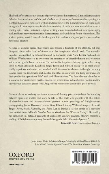 This book offers a revisionist account of poetry and embodiment from Milton to Romanticism. Scholars have made much of the period's theories of matter, with some studies equating the eighteenth century's modernity with its materialism. Yet the Enlightenment in Britain also brought bold new arguments for the immateriality of spirit and evocative claims about an imminent spirit realm. Protestant religious writing was of two minds about futurity, swinging back and forth between patience for the resurrected body and desire for the released soul. This ancient pattern carried over, the book argues, into understandings of poetry as a modern devotional practice. A range of authors agreed that poems can provide a foretaste of the afterlife, but they disagreed about what kind of future state the imagination should seek. The mortalist impulse--exemplified by John Milton and by Romantic poets Anna Letitia Barbauld and William Wordsworth--is to overcome the temptation of disembodiment and to restore spirit to its rightful home in matter. The spiritualist impulse--driving eighteenth-century verse by Mark Akenside, Elizabeth Singer Rowe, and Edward Young--is to break out of bodily repetition and enjoy the detached soul's freedom in advance. Although the study isolates these two tendencies, each needed the other as a source in the Enlightenment, and their productive opposition didn't end with Romanticism. The final chapter identifies an alternative Romantic vision that keeps open the possibility of a disembodied poetics, and the introduction considers present-day Anglophone writers who put it into practice.