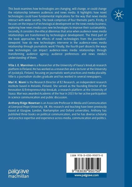 This book examines how technologies are changing, will change, or could change the relationship between audiences and news media. It highlights how novel technologies could have fundamental implications for the way that news media interact with wider society. The book comprises of four thematic parts. Firstly, it focuses on the impact of technological development on the news media business, exploring how news media uses new technologies to improve their sustainability. Secondly, it considers the ethical dilemmas that arise when audience-news media relationships are transformed by technological development. The third part of the book approaches the effects of novel technologies from the journalists' viewpoint: how do new technologies intervene in the audience-news media relationship through journalistic work? Finally, the fourth part dissects the ways new technologies can impact audience-news media relationships through transforming audience agency, audience preferences and news media's understanding of them.