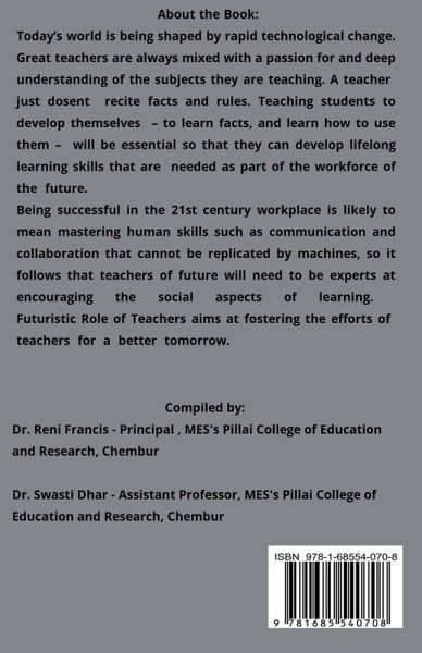 Today's world is being shaped by rapid technological change. Great teachers are always mixed with a passion for and deep understanding of the subjects they are teaching. A teacher just dosent recite facts and rules. Teaching students to develop themselves - to learn facts, and learn how to use them - will be essential so that they can develop lifelong learning skills that are needed as part of the workforce of the future. Being successful in the 21st century workplace is likely to mean mastering human skills such as communication and collaboration that cannot be replicated by machines, so it follows that teachers of future will need to be experts at encouraging the social aspects of learning. Futuristic Role of Teachers aims at fostering the efforts of teachers for a better tomorrow.